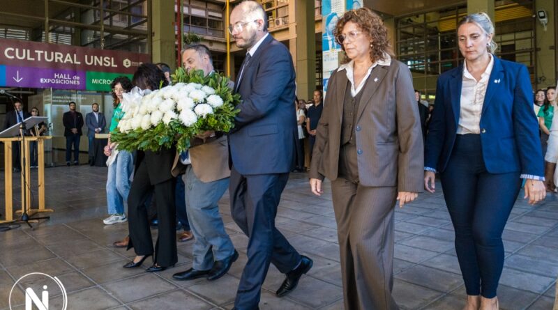 Posteriormente, el rector de la Institución, Dr. Raúl Gil manifestó que al depositar la ofrenda floral ante la figura de nuestro rector desaparecido, Mauricio Amílcar López, ubicada en la explanada que es símbolo de nuestra identidad y de nuestra resistencia, no solo cumplimos con un protocolo de memoria, sino que se renueva el contrato ético que define a la Universidad Nacional de San Luis.